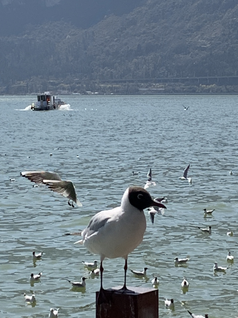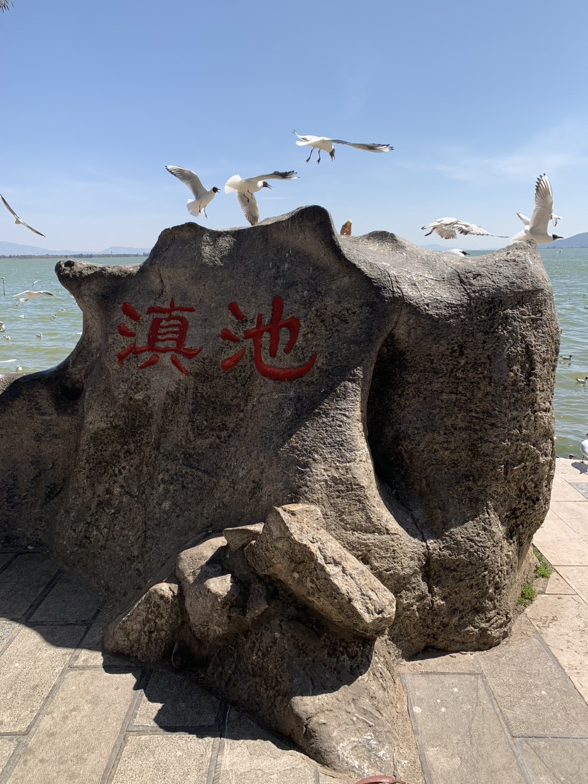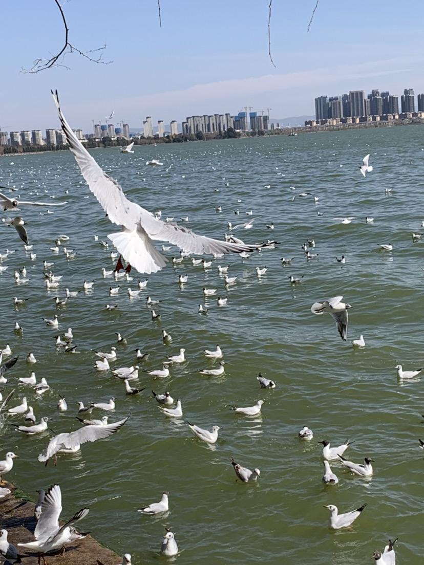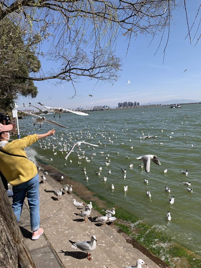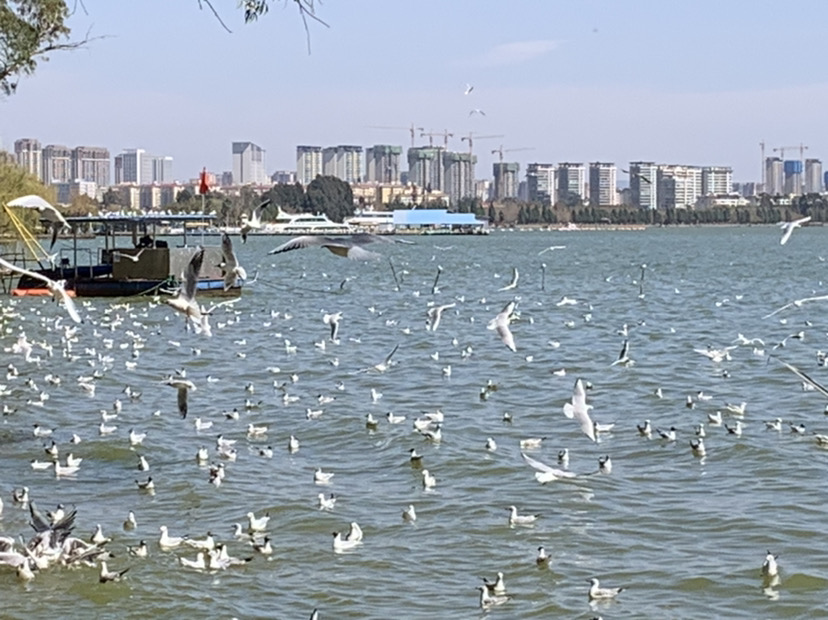 每年入冬后的昆明滇池都会吸引很多慕名而来的游客,为什么呢?偏偏在这个时间段的滇池会吸引到那么多人?因为每年的冬季到入春后的一个多月在滇池上聚集着大量红嘴海鸥,着实壮观。是年轻情侣浪漫的邂逅之地,也是茶余饭后年老者散步强身之地。这时的海鸥漫天飞舞,池堤上的游客不时将手中的食物喂食给海鸥,海鸥好像已经习惯了这种从游人手中食取食物的安全感,形成了昆明的一道天然的季节性风光。